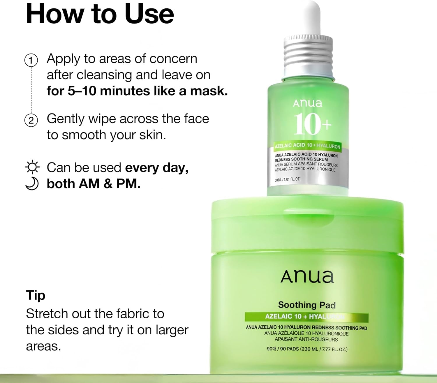 Soothe irritated, redness-prone skin with the ANUA Azelaic 10 Hyaluron Redness Soothing Pad — your all-in-one calming toner pad for sensitive skin. Each pre-soaked pad is infused with 10% Azelaic Acid and 7-Cica Complex to effectively reduce redness and calm irritation caused by dryness or environmental stressors.