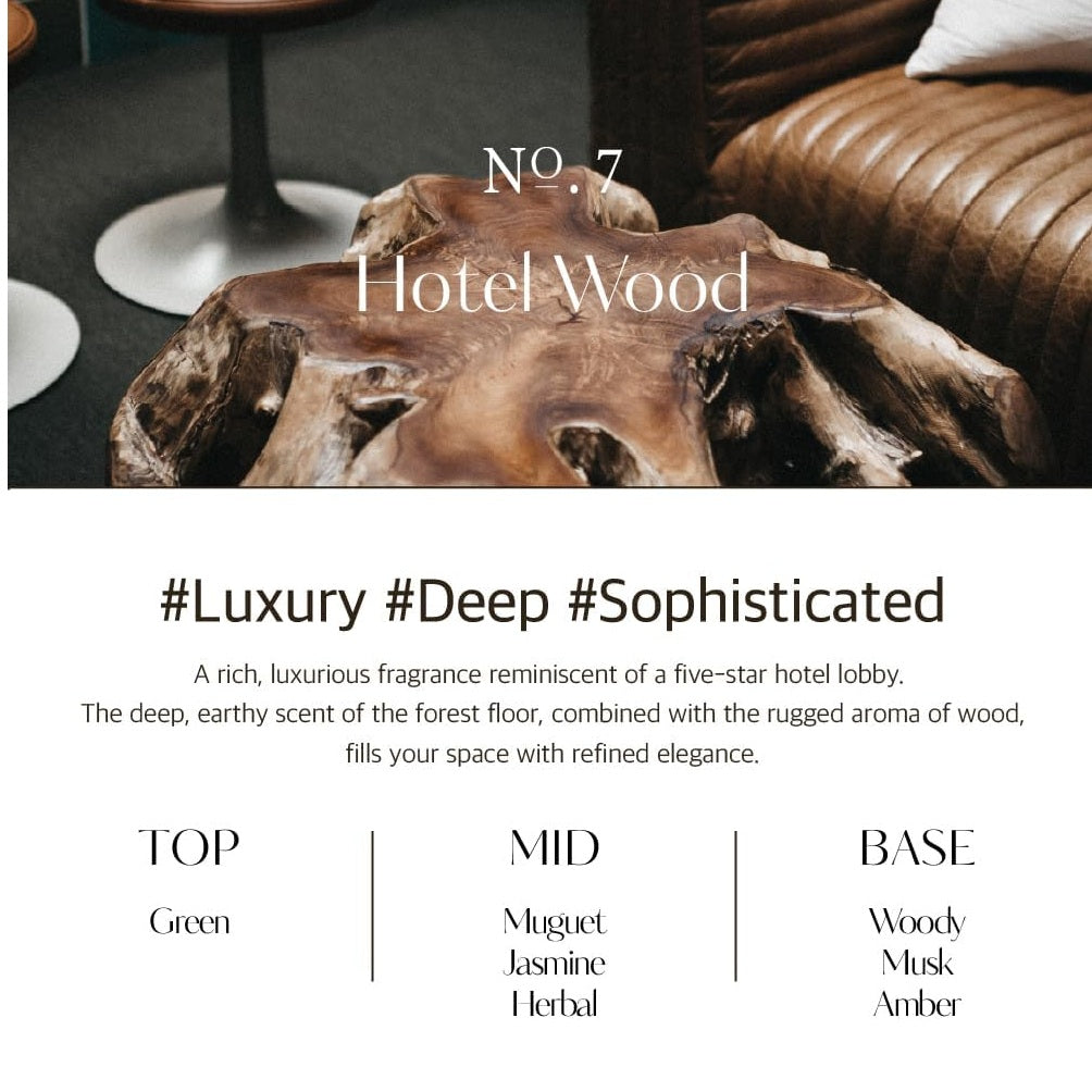 Hotel Wood: Immerse in the deep, woody aroma of Hotel Wood. This luxurious scent combines the earthiness of forest soil with the rich, enduring fragrance of aged trees, bringing a touch of sophistication to your daily routine.